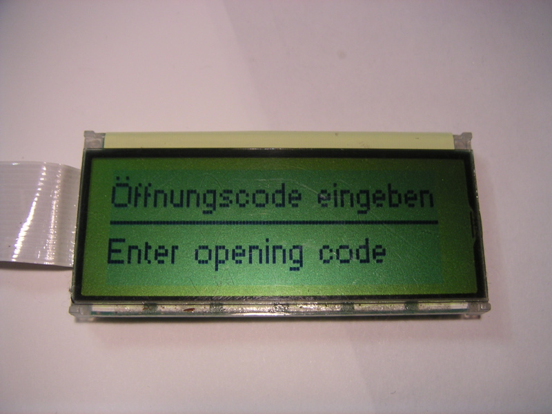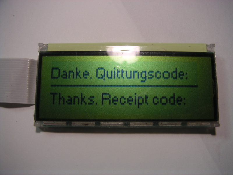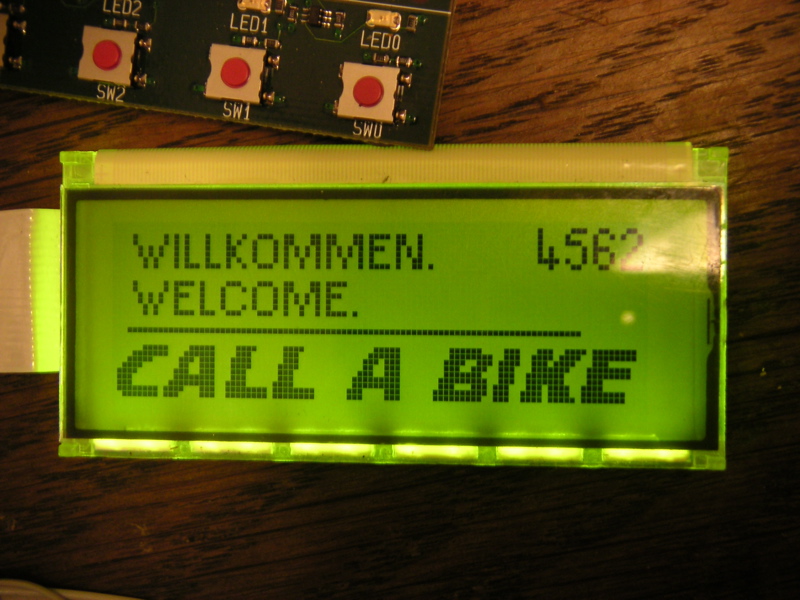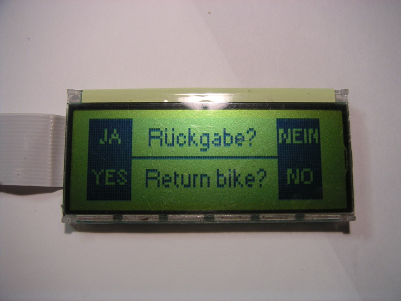 Wer sich das Display mal genauer angeschaut hat, wird festgestellt haben, daß der Zeichensatz ein proportionaler ist. Dazu gibt es im Code eine Tabelle, in der die Länge des Zeichens und die Position im Flash gespeichert sind. Ein ‘i’ und ein ‘!’ belegen nur ein Byte, wogegen z. B. ein ‘w’ sieben Bytes belegt. Die großen Logos und das Zahleneingabefeld liegen als 400 Byte große Bitmaps vor. Die lange schwarze Linie im Call-a-Bike-Logo zeigt die Stärke der Spule im Schloß an. Das haben wir nur durch das Code-Auditing herausgefunden.
