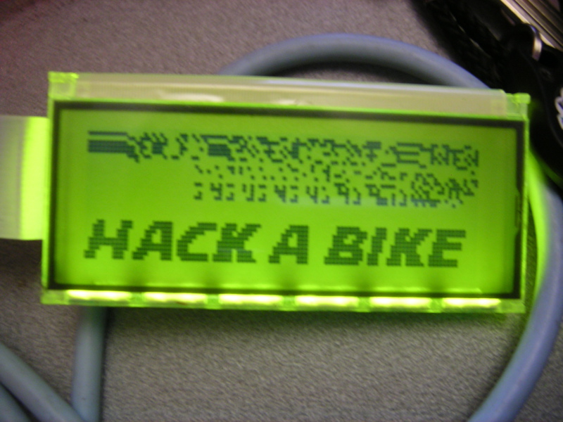 Nachdem wir uns diese Grundlage geschaffen hatten, konnten wir das CallABike mit unserem eigenen Code flashen. Da wir keine Vulnerabilities oder Backdoors fanden (jedes CallABike hat einen eigenen Key, der im EEPROM gespeichert ist), mit denen man ein CallABike exploiten könnte, ohne es aufzuschrauben, kamen wir auf die Idee, uns eine eigene Backdoor in den Code zu programmieren. Hört sich eigentlich ganz leicht an, ist es aber nicht. Erstmal mussten wir den Code der BAHN optimieren, um uns den entsprechenden Platz zu schaffen. Schließlich sollte ja auch noch ein Logo mit 400 Bytes von uns in das 8KB große Flash. Den Datenmüll, den man über unserem HackABike Logo sehen kann, ist der Backdoor Code. Das sparte nochmal ca. 150 Bytes. Außerdem wollten wir nicht, dass man mit dem Backdoor Code normalen Kunden, die das Rad nur geparkt (verschlossen, aber nicht abgegeben) haben, das ausgeliehene HackABike wegschnappen konnte. Das erforderte noch ein paar Zeilen mehr im Code. Auch kann man mit unserem Backdoor Code das HackABike nicht ‘parken’, da ja der öffner nichts bezahlen muss und deswegen nicht motiviert ist, sich weiter um das Rad zu kümmern, und es aber auch niemand anders aufmachen könnte. Um das HackABike auch auf größere Entfernung noch von seinen unbehandelten Verwandten unterscheiden zu können, haben wir ihm eine leicht veränderte Blink-Sequenz beigebracht.