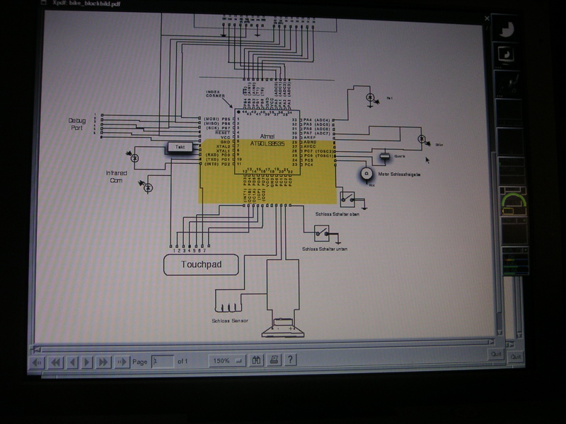 Wenn man eine normale Glühlampe benutzt, um besser sehen zu können, piepte die Elektronik gelegentlich scheinbar unmotiviert. Wie sich später herausstellte, reichte der durch die Glühlampe emittierte IR-Anteil aus, um den IR-Receiver zu triggern und den Bootvorgang fortzusetzen. Beim Booten testet sich das System selbst, und der Empfang eines Infrarot-Signals gehört eben dazu. Im Zuge fortschreitender Professionalisierung™ wurde in der Folgezeit die Glühlampe durch ein Infrarot-Photon-Micro-Light ersetzt. Bei unserer weiteren Analyse des Systems begannen wir damit, alle Anschlüsse des Atmel durchzumessen, um uns einen ungefähren Schaltplan zu erstellen (siehe Bild). Die Datenblätter für den Atmel und das verwendete Display haben wir uns aus dem Web besorgt.